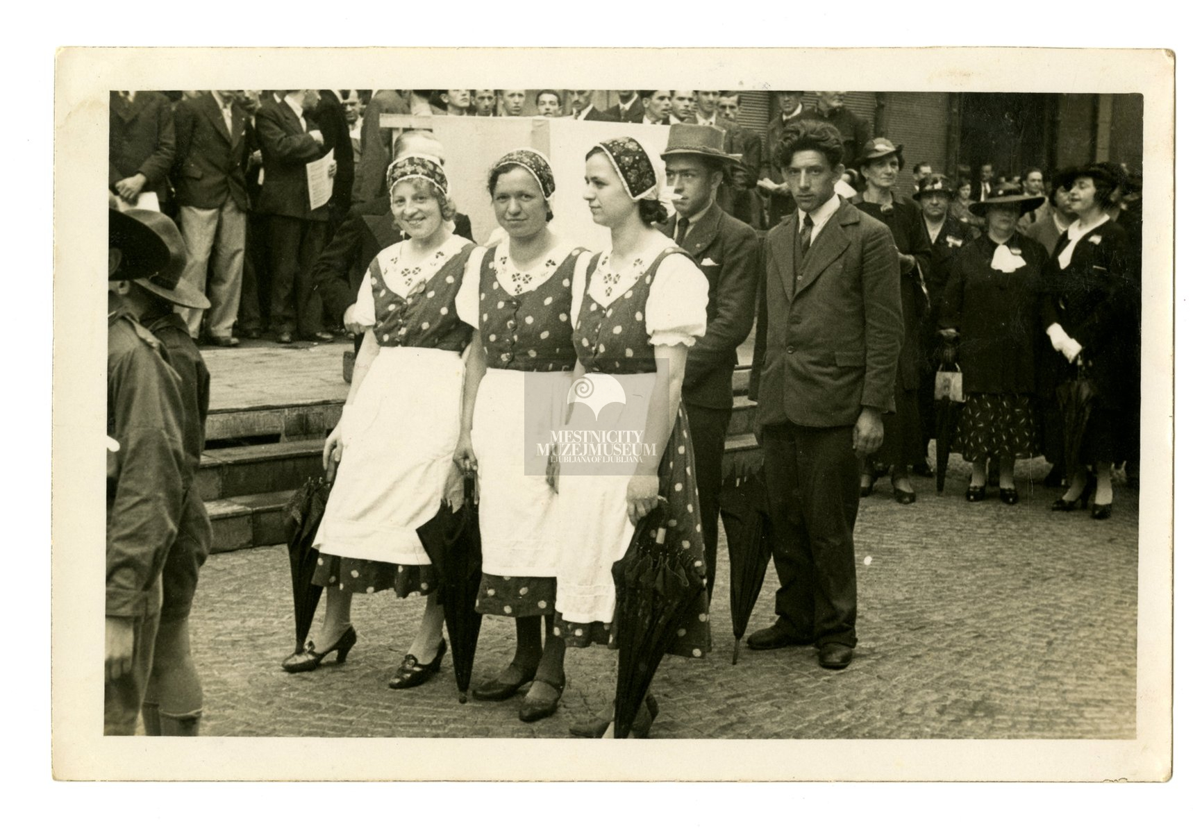 Članice društva kmečkih fantov in deklet iz Beričevega, v kroju slovenske dečve, okoli 1930.